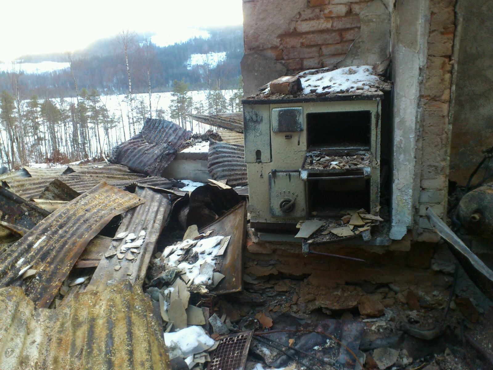 Det var ett trist möte med det lilla samhällets gamla Folkets hus. Som synes finns bara spisen och skorstensmuren kvar efter lågornas härjningar. Orsaken vet jag inget om, men det är på kort tid den tredje storbranden i denna del av kommunen.